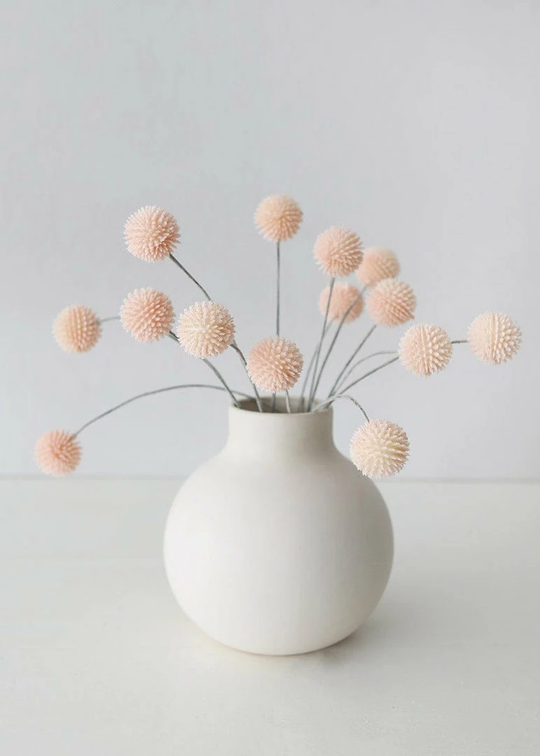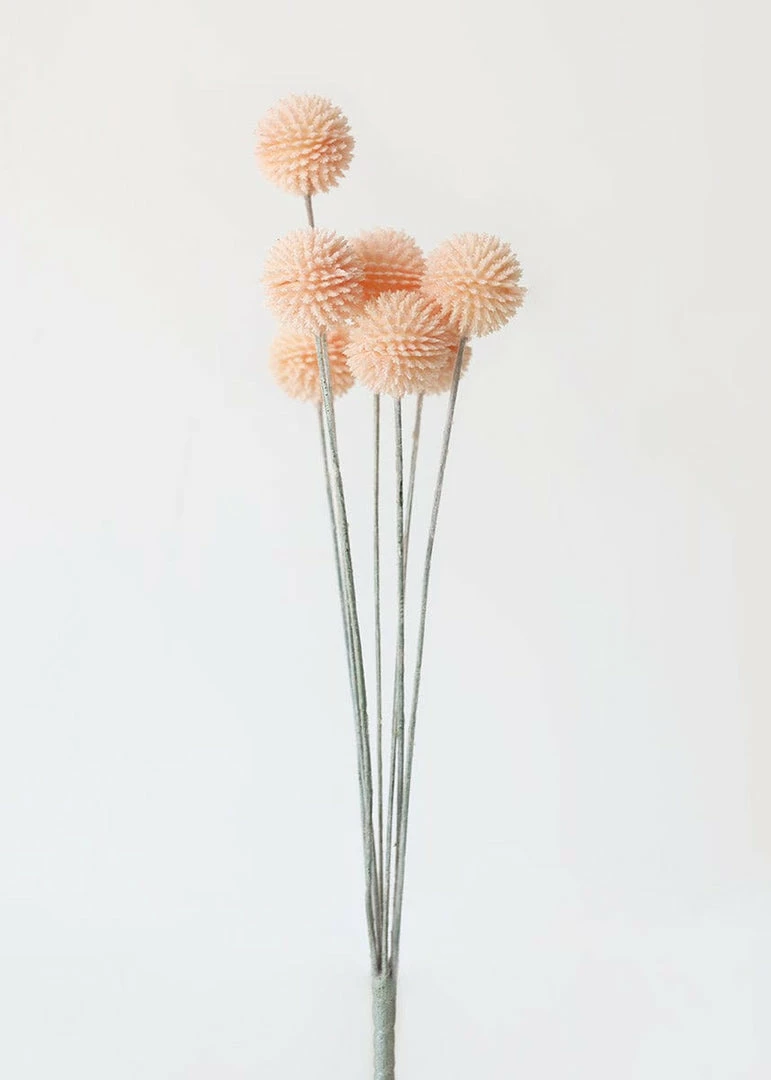 Add texture and the most delicate hint of color with soft peach artificial billy buttons. These flower heads are slightly flocked to lend a realistic look and feel in addition to lifelike stems that are textured and wired to easily create shape to your arrangements. These peachy-pink florals include 7 blooms to each base stem that can easily be trimmed down for separate placement in bud vases or for use in different floral projects.
