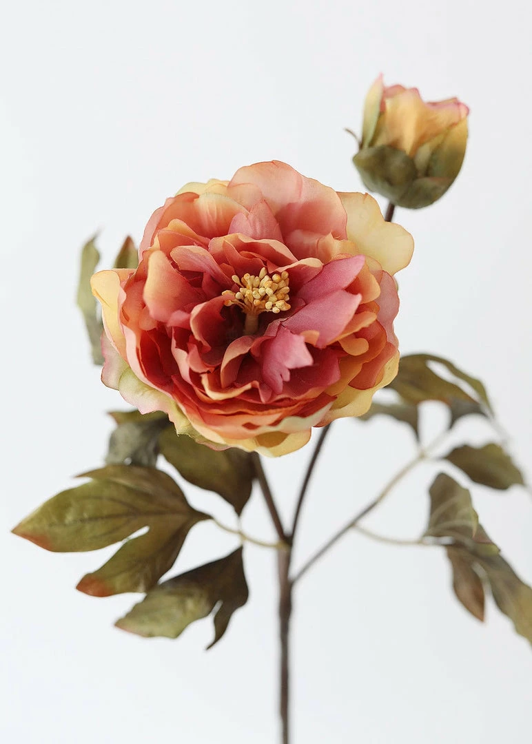 Find artificial flowers for fall home decor, like this stunning silk peony stem in terracotta orange with mauve accents. These fake peonies are the perfect autumn hue to complete your fall wreaths and vase arrangements.