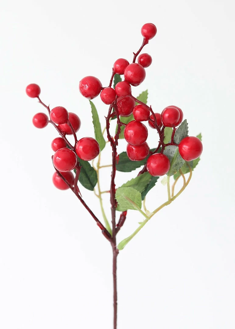 Get artificial red winter berries for your holiday bouquets and Christmas centerpieces, like this adorable red berry spray with green leaf accents. These cute red berries are the perfect way to add a pop of festive color to any design!