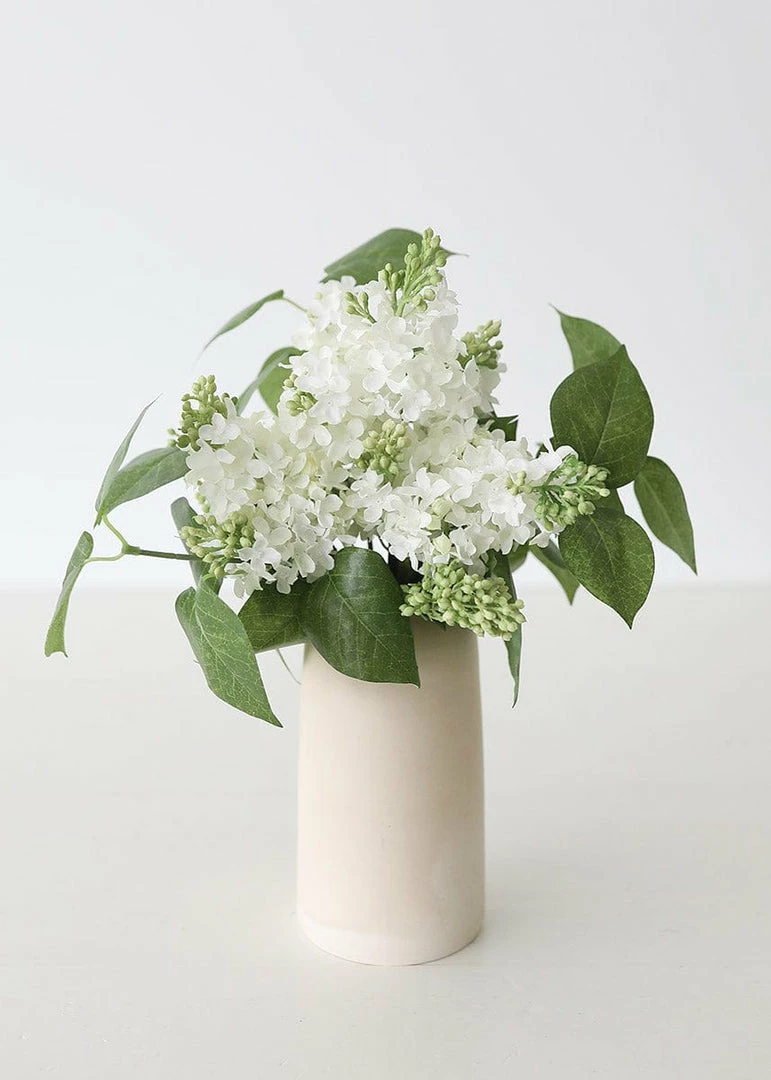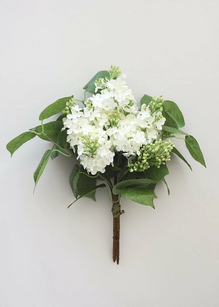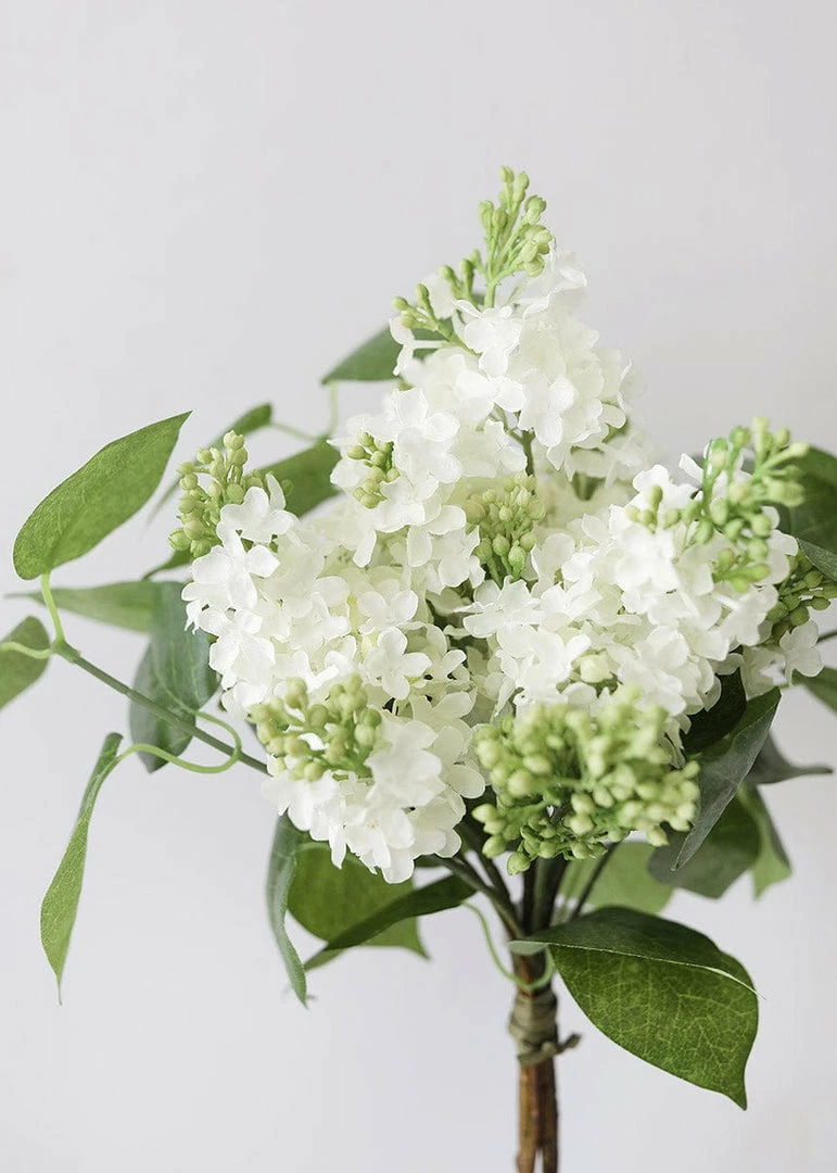 If you love lilacs, this stunning bouquet of white artificial spring lilac flowers and green leaves is the one for you! It fits the bill for any wedding no matter the season, and also makes a beautiful drop in vase arrangement.