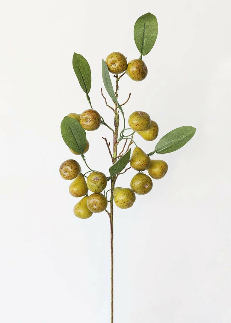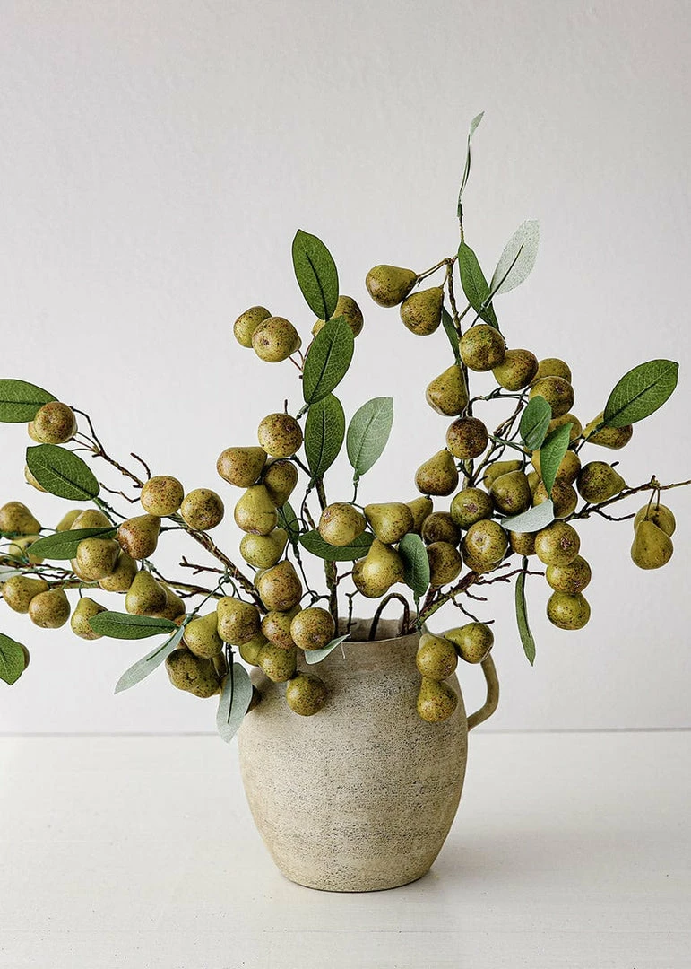 Enjoy the look of fresh pears without the fuss. This artificial pear fruit branch mimics the natural beauty of the delicate Conference Pear, speckled with burgundy and deep green tones. Offering a fully wired stem, this branch allows for flexibility in any arrangement or to display in a tall vase for a cascading look. Pairs well with a distressed pitcher vase or as a natural accent in your faux floral arrangements.