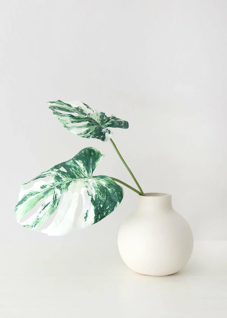Find faux tropical leaves to make a stunning statement piece, like this gorgeous variegated green and white monstera palm leaf bundle with coloring on both sides of the leaves. Simply style these artificial palms in your tall vase.