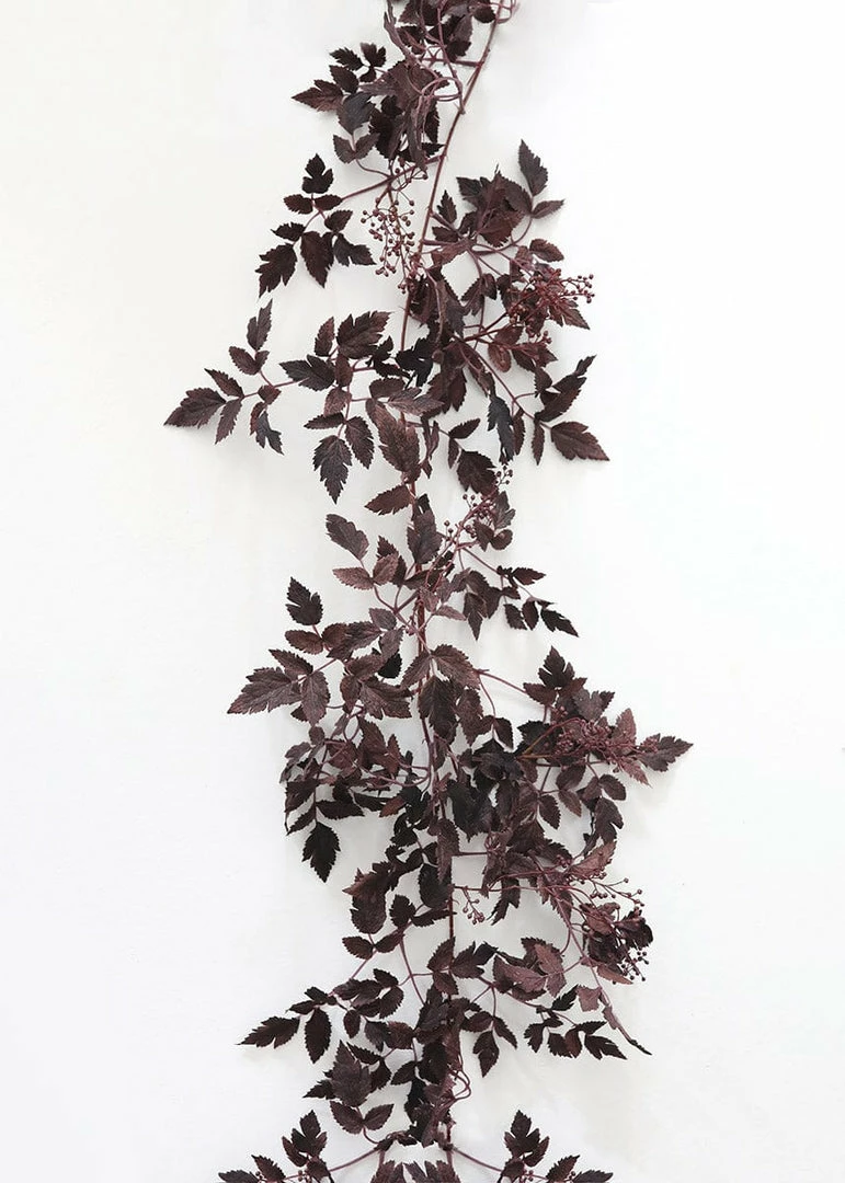 Add a nature-inspired look to your mantle centerpieces and wedding tablescapes for fall with this stunning plum purple artificial Cimicifuga Ramosa leaf garland. The incredibly realistic Hillside Black Beauty leaves have a dramatic, rich hue that complements any autumn color palette.