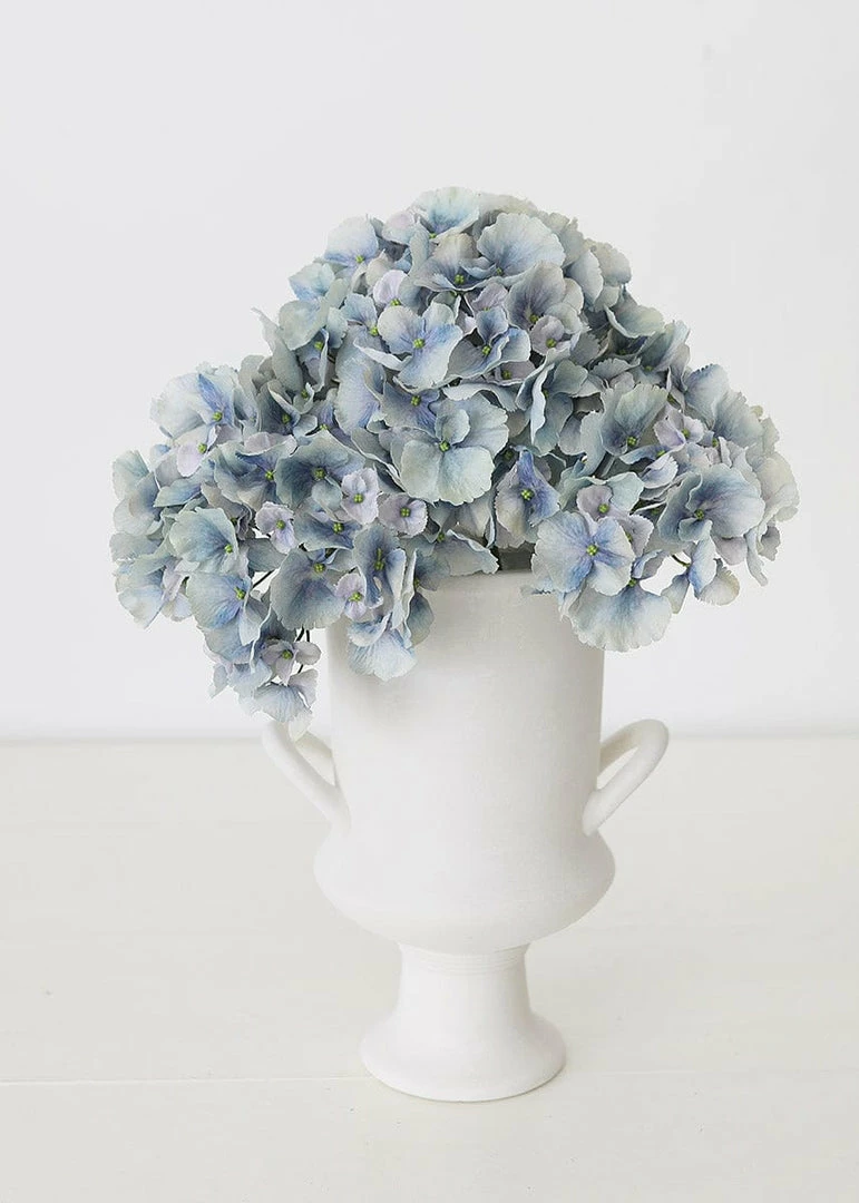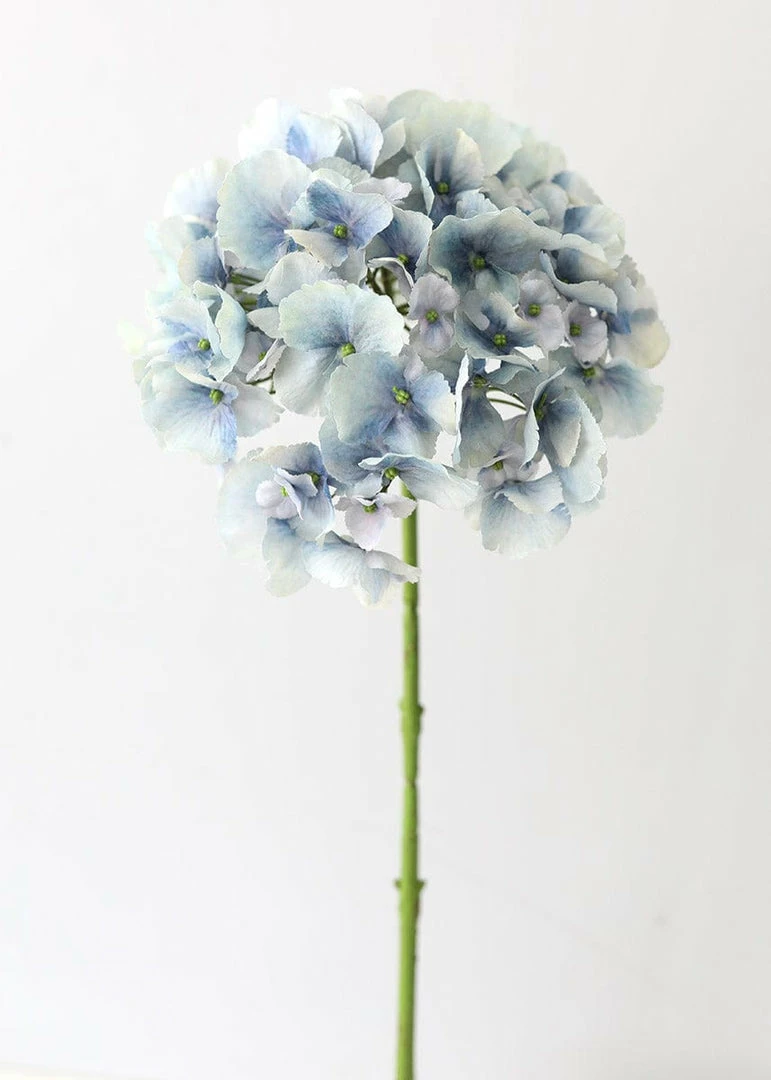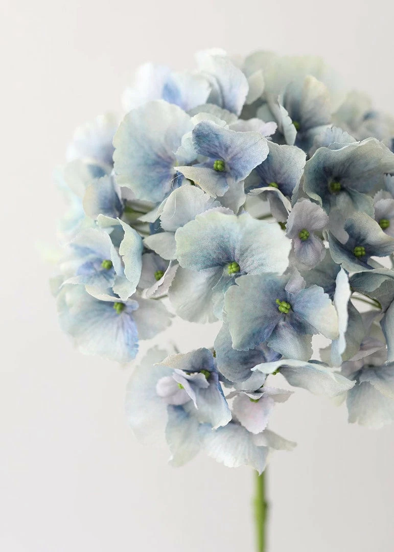 Find fake hydrangeas, like this soft but striking blue gray artificial hydrangea flowers stem with an oversized, jumbo bloom. Its subtle coloring certainly enhances your neutral floral arrangements.