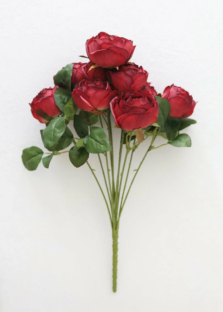 This gorgeous burgundy artificial rose flowers bush is just what you need for fall floral styling. Simply drop it in a vase for an easy but stunning centerpiece, or clip apart to add the fake roses to wedding flower bouquets.