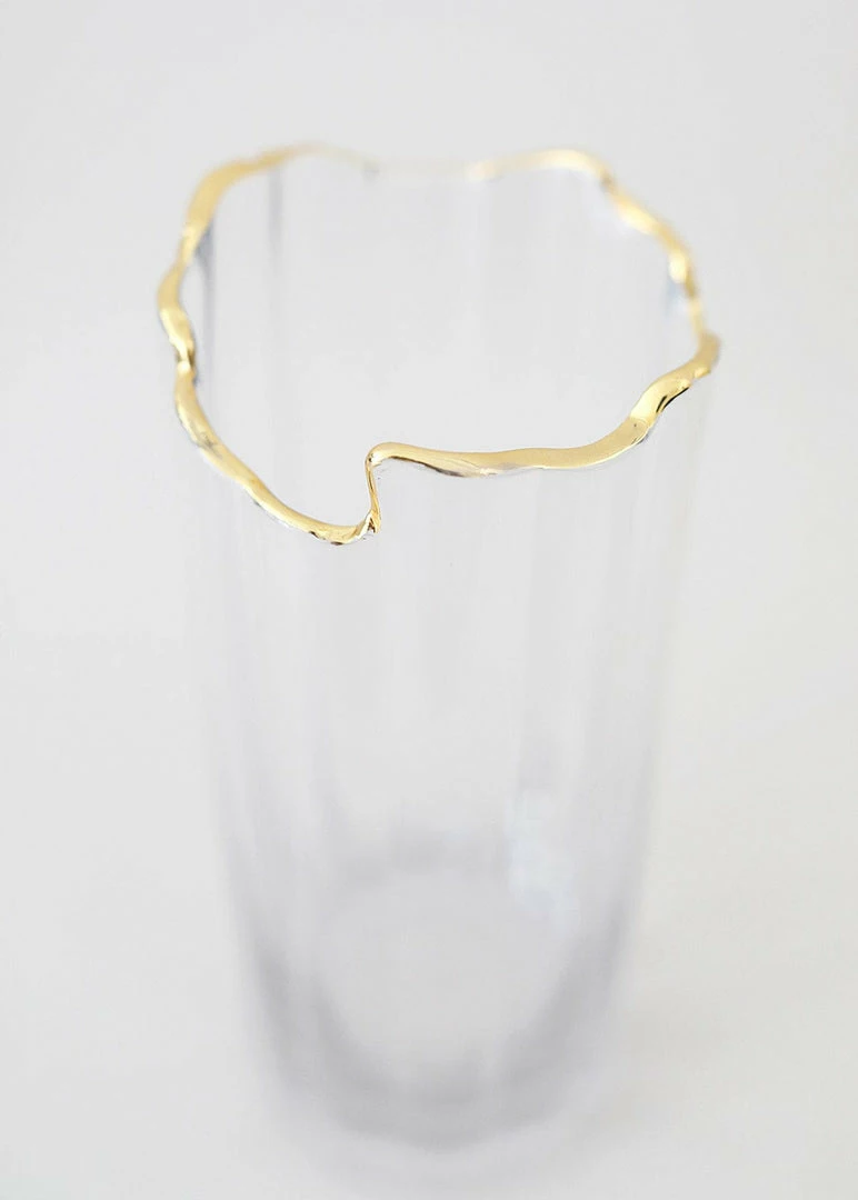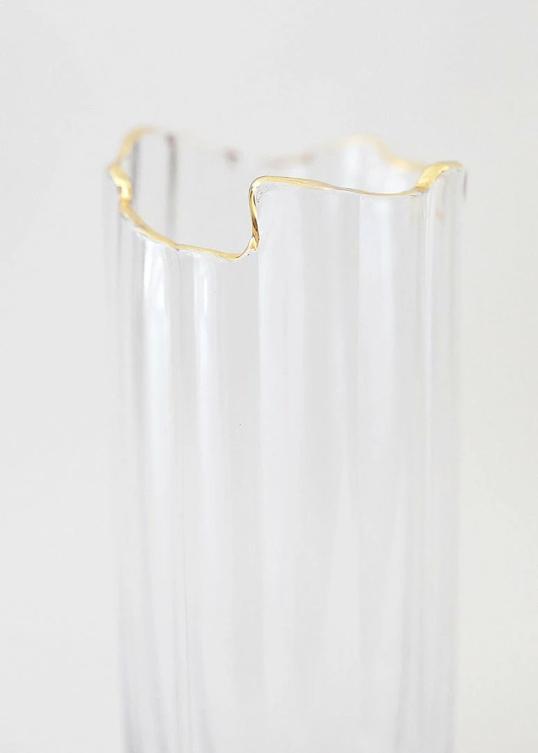 Inspired by the Gatsby era, this clear glass vase with a gold rim brings an understated elegance to any arrangement. With organic curves and a slightly ribbed texture, this glass vase adds dimension without overpowering. Simply drop a handful of artificial tulips inside and embrace an effortless, yet chic simple styling.