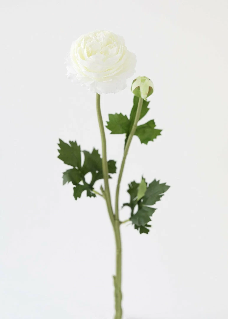 Beautiful cream white silk ranunculus stem with a bud is the perfect bloom to lend an elegant and realistic touch to your faux floral arrangements or wedding flower bouquets. Add these artificial flowers to any design to create a classic, sophisticated look that never goes out of style.