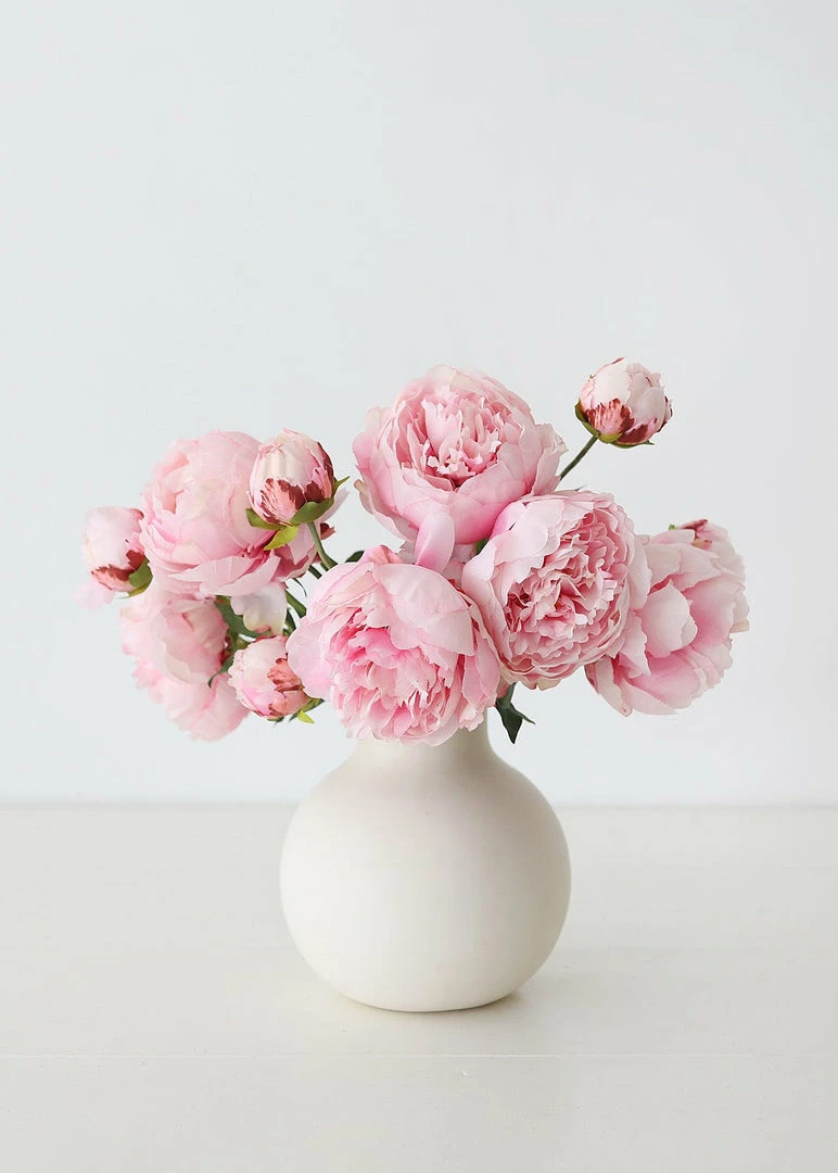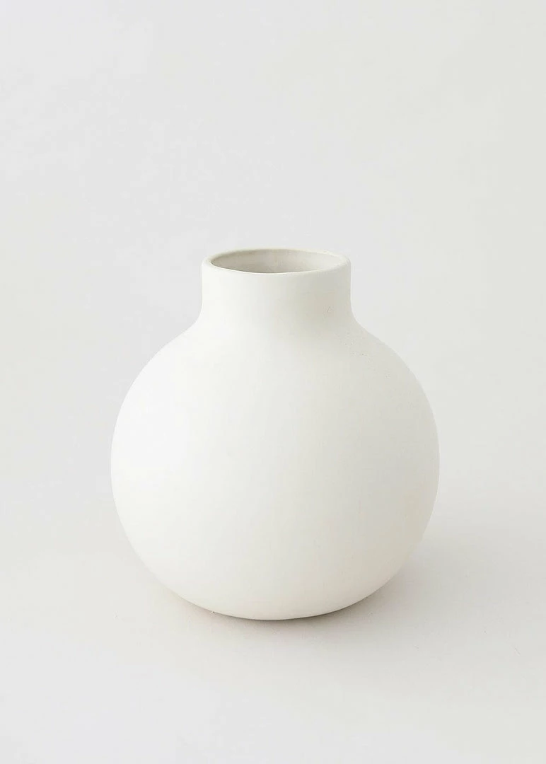 Find a neutral yet stunning round creamy white ceramic vase. Add faux florals or dried stems for a chic look.