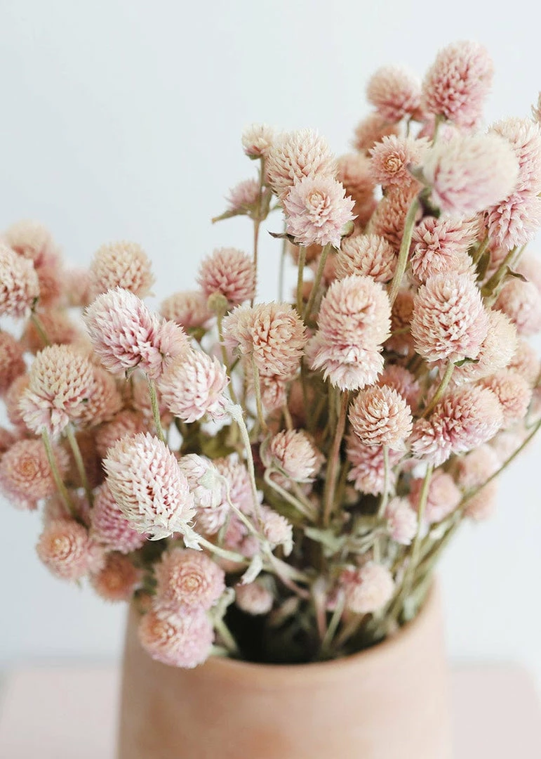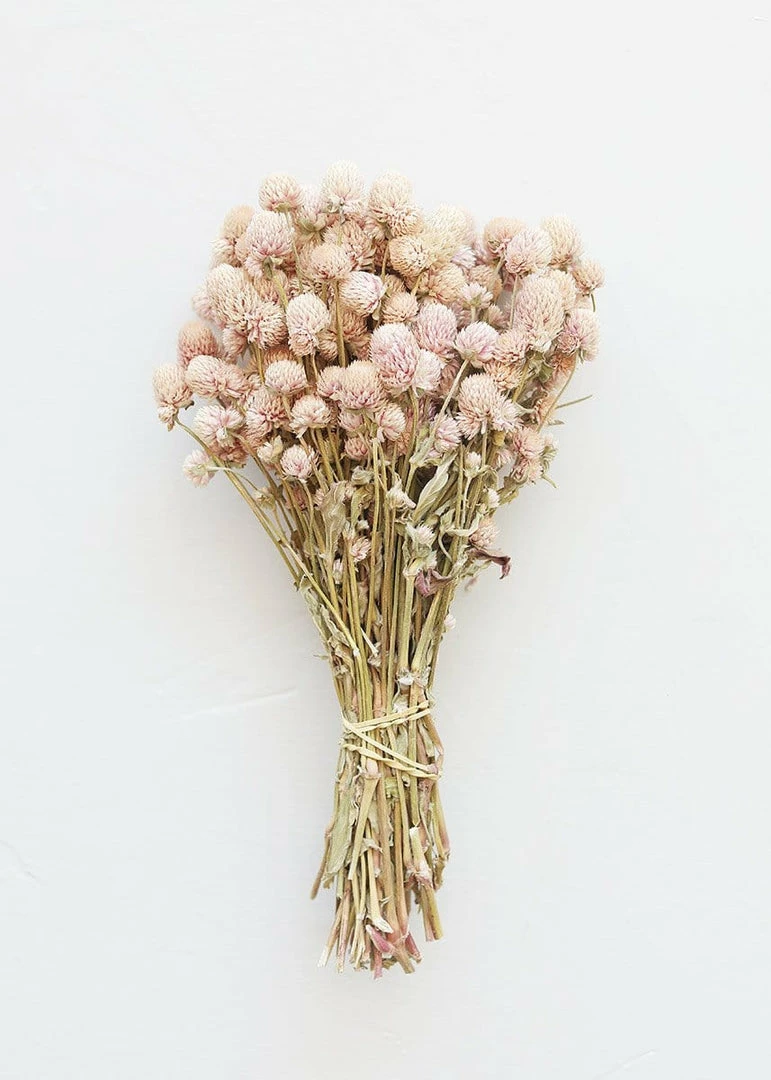 Each hand-gathered bundle of soft pink dried globe amaranth flowers are hand-harvested and naturally dried on a small flower farm in the northwest and are now brought to your home.