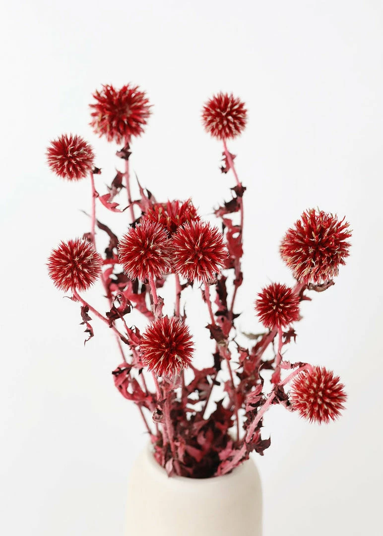 Add a touch of texture to your dried flower arrangements with red burgundy dried echinops thistle flowers. Delicate and funky, these red dried thistle flowers are perfect styled alone in a bud vase or tucked into a dried flower arrangement for extra depth and dimension. Dried and preserved items may arrive with a slight odor, allow to breathe for 5-7 days in a well-ventilated area.