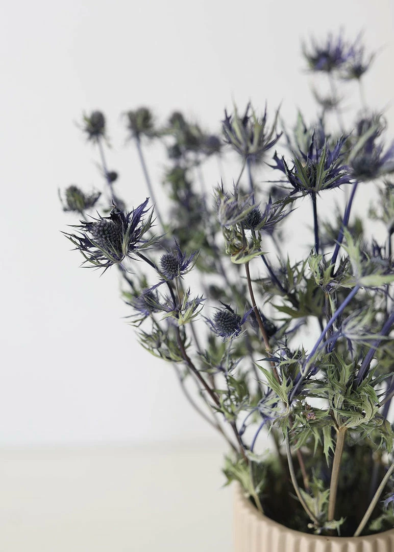 Elevate your vase styling with naturally beautiful botanicals. This fresh from the field blue star sea holly thistle was grown, harvested, and dried on a solar-powered farm in the Netherlands.