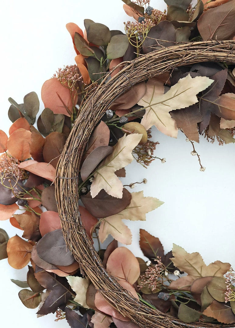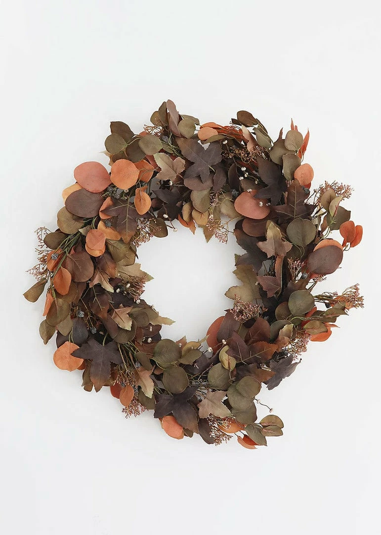Find artificial wreaths for simple home decorating this autumn season, like this stunning, fake eucalyptus wreath. The contrasting shades of rich brown leaves make this wreath perfect for your neutral style.