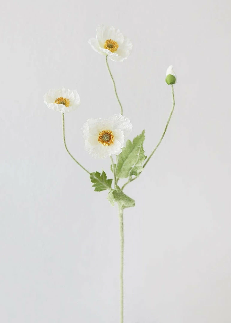 Your faux summer floral arrangements and wedding flower bouquets call for playful poppies! These white artificial poppy wildflowers have ultra-realistic petals, flocked green leaves and stems that make them a beautiful replica of nature.