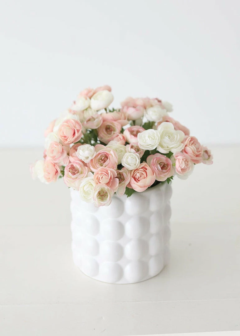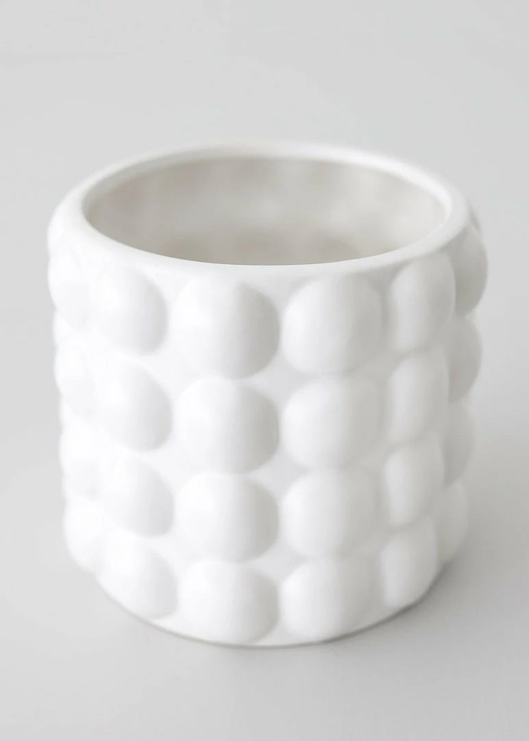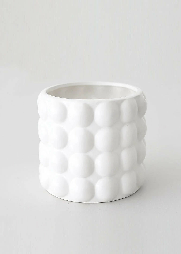 Elevate your decor with unique planters like this matte white ceramic textured pot from the Bubble Collection. The large hobnail knobs add character, making this pot a chic home for your plant. NOT Frost Proof, store inside during winter months.