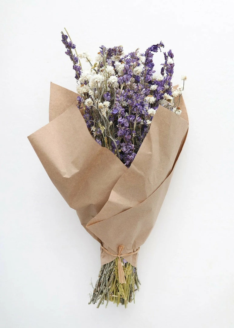 A true botanical beauty that invites the feeling of nature into your home, this stunning bouquet of dried florals features lavender purple larkspur wildflowers and white mini daisies. The best part? It’s vase ready! These naturally beautiful and unique flowers were grown and arranged on a small flower farm in Mexico.