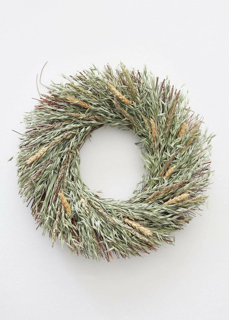 Incorporate rustic charm into your home styling with this naturally green and tan dried grass wreath. Each uniquely beautiful and handmade wreath features wheat and oat grains grown on a sustainable flower farm in Mexico.