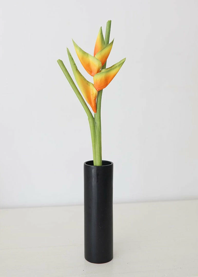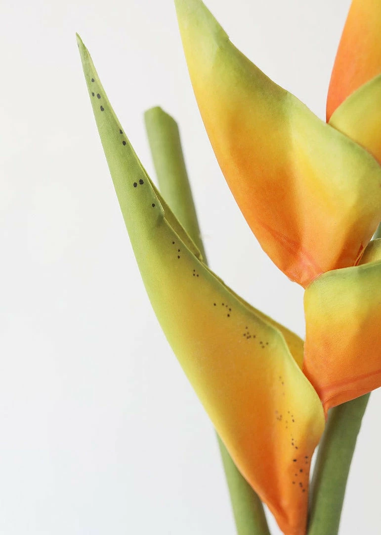 This gorgeous orange and green heliconia flowers stem is a striking example of artificial Hawaiian botanicals. Simply style it in your faux tropical flower arrangement to create an elevated exotic design.