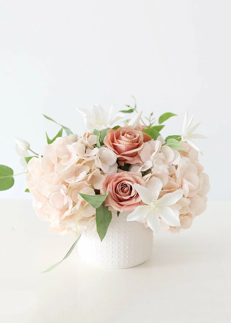 Make a statement with oversized artificial flowers, like this lovely soft blush pink hydrangea stem with a jumbo silk bloom. You just need to style it in your favorite bud vase to complete a fresh, trendy look.
