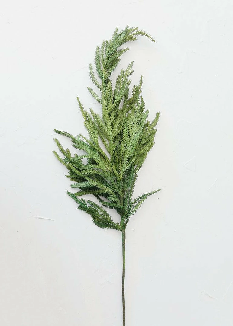 Create amazing Christmas centerpieces with this faux Norfolk pine branch that features the most realistic artificial holiday greens. Soft-to-the-touch pine sprigs in natural green color perfectly mimic the feel and the look of nature. Style this spectacular greenery in your tall woodland vase arrangements, winter wedding bouquets, and boutonnieres. Even make a stunning 6-foot garland using 3 branches.