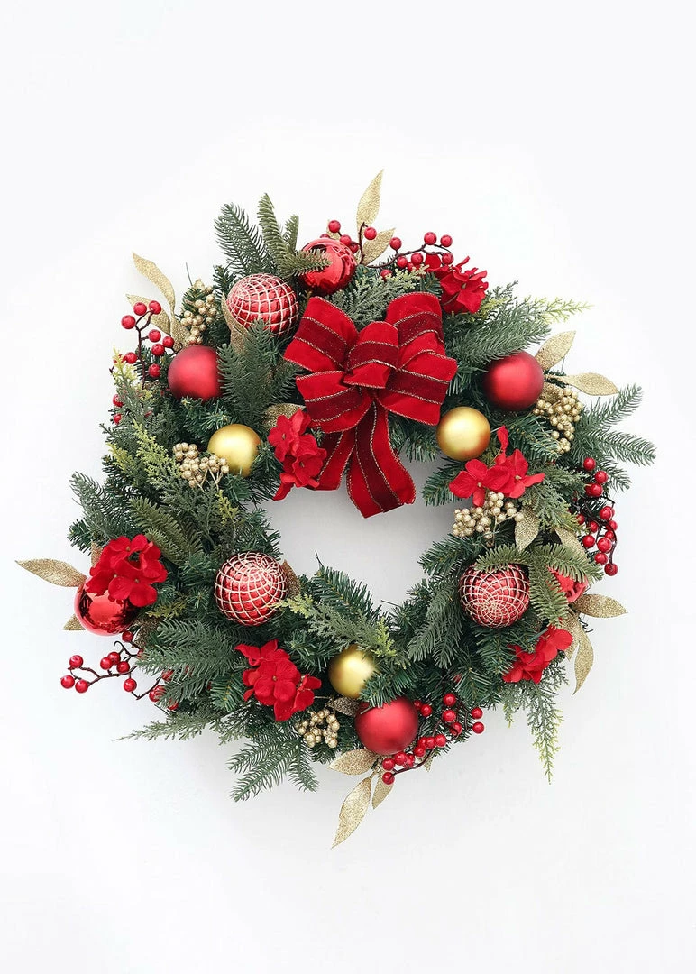 Find artificial Christmas wreaths, like this festive pine wreath. It’s decorated with red and gold accents including ball ornaments, glittered fake berries and leaves, and small flowers. The red velvet ribbon completes the look.