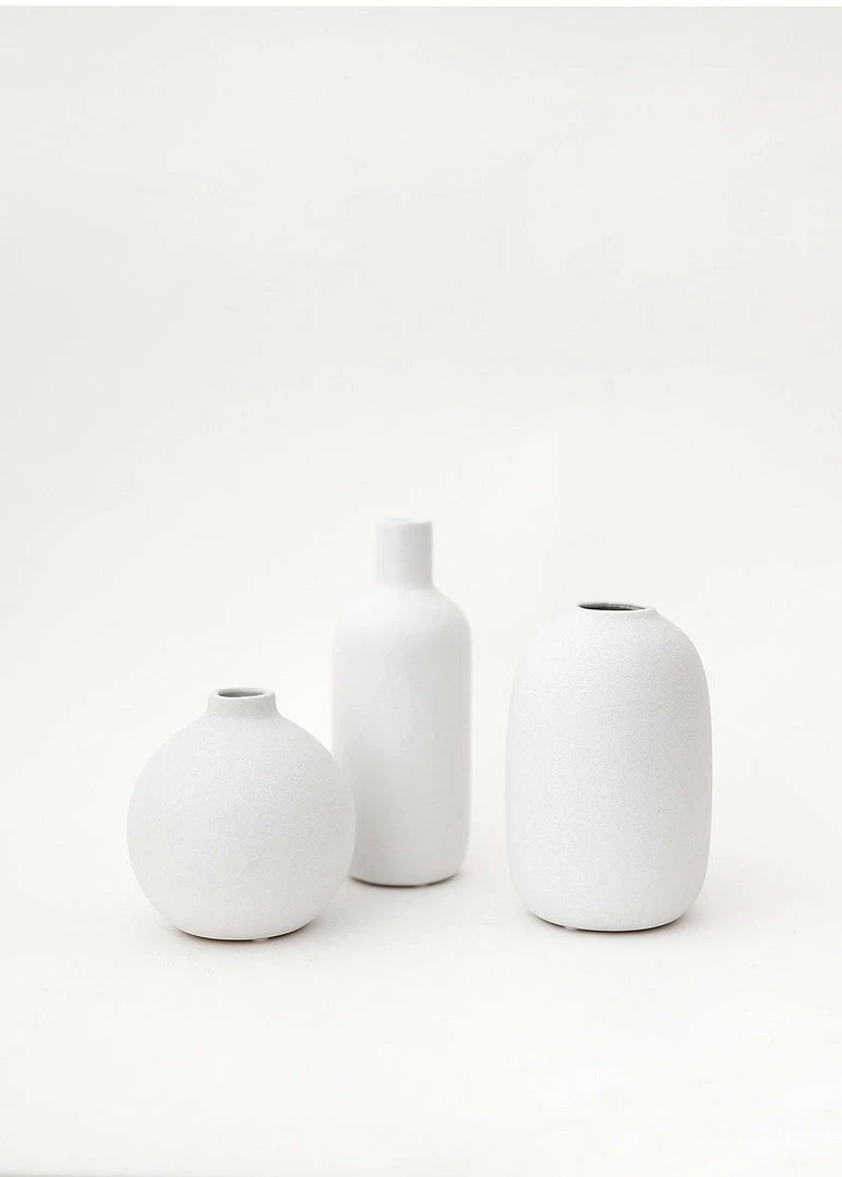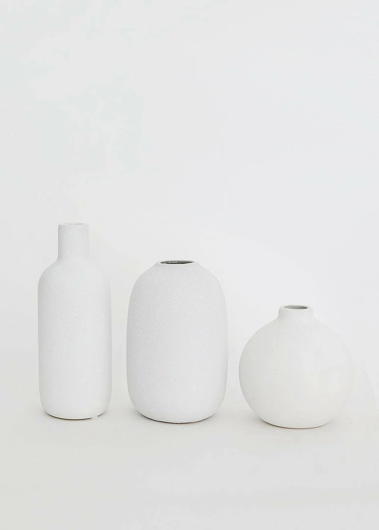 Find flower vases in different sizes for home tabletop and shelf styling, like this set of matte white ceramic bud vases in bottle, oval, and round shapes. Simply use a mix of artificial and dried stems to create your unique designs.