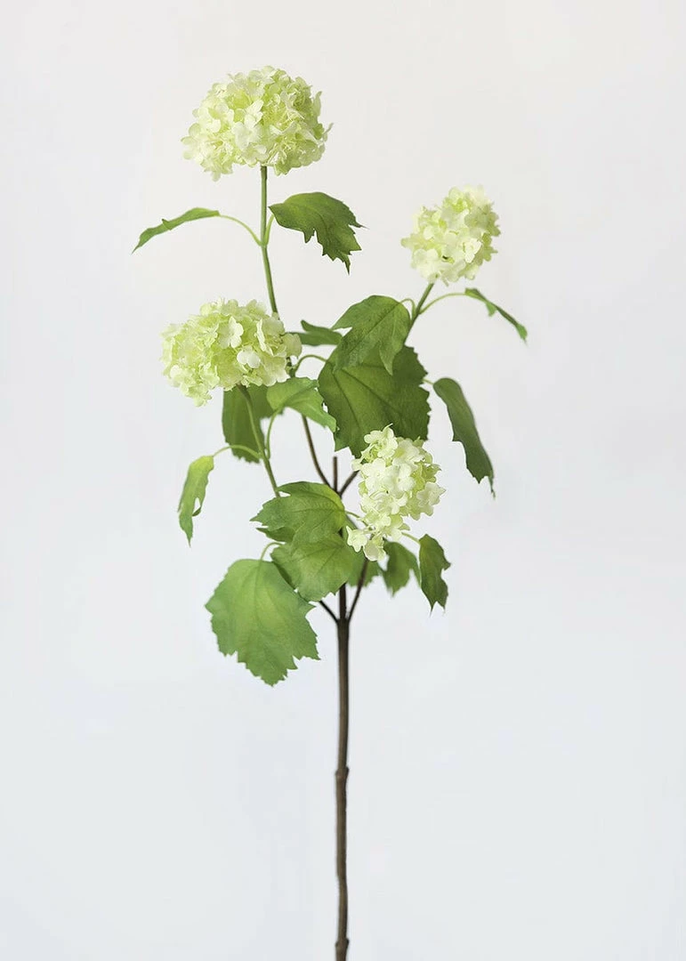 This stunning soft green artificial snowball spray has large flowers that look like hydrangeas. Style the fluffy blooms in a vase arrangement to create a simple but elevated high-end design that welcomes the feeling of nature.