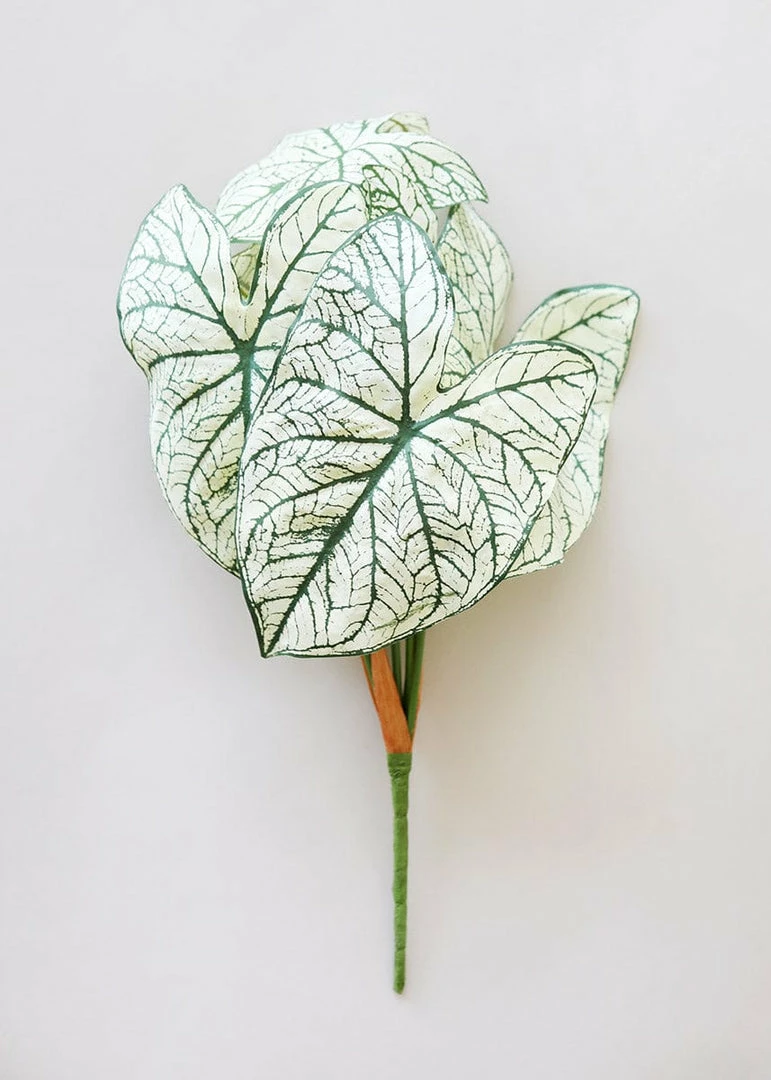 Bring the tropics into your home with this variegated tropical Caladium plant. These cream green and green variegated silk leaves offer an oversized elephant ear shape, and a smooth green wired stem to easily give shape and dimension to your faux plant.