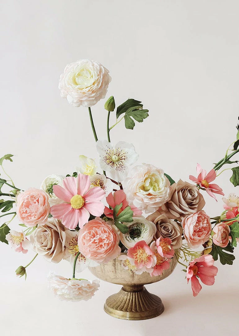 Find gold metal floral containers for your vintage wedding centerpieces like this beautiful distressed gold metal compote bowl. Just fill with your favorite silk flowers to create a simple yet gorgeous arrangement you can display in your home later.