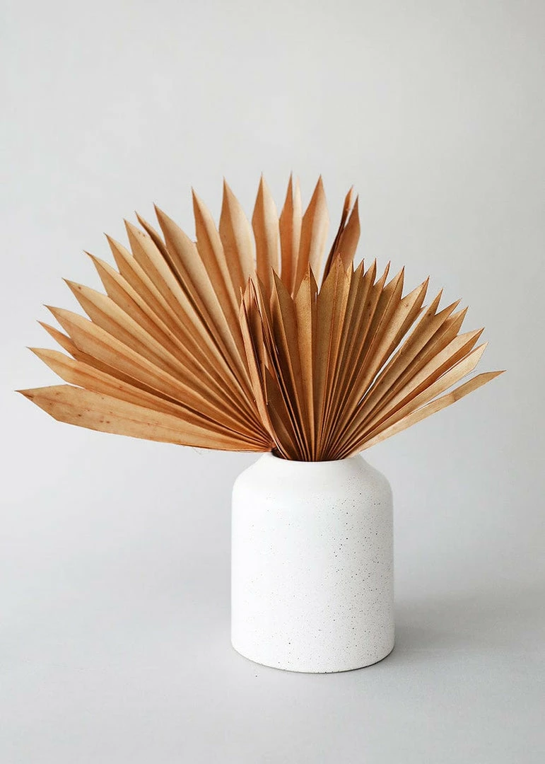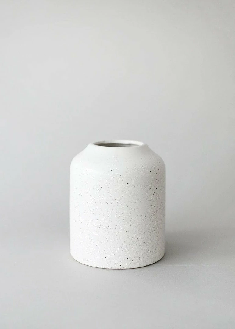 Shop the Flynn Collection for a modern style. This white ceramic speckled vase is perfect for any room, from a kitchen counter centerpiece to side table arrangements.