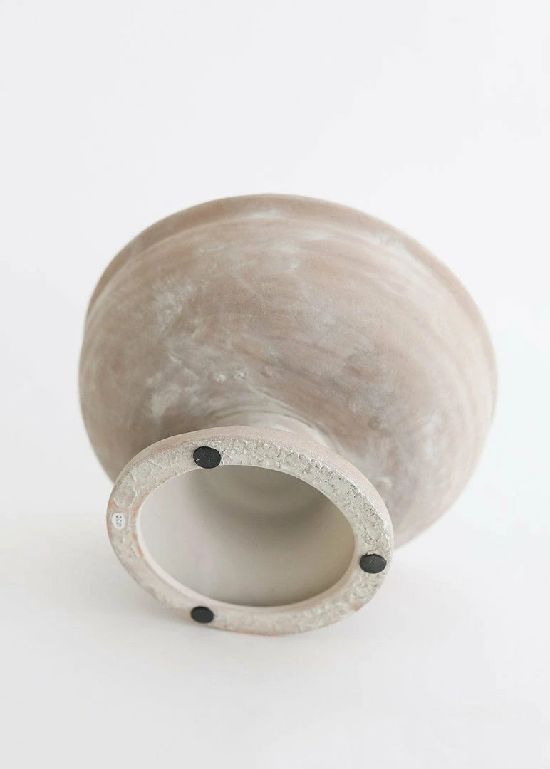 Beautiful ceramic compote bowl in whitewashed sand from the Winnie Collection is great to use as a planter. The inside of the bowl has mauve brown earth tones that complement a boho look.