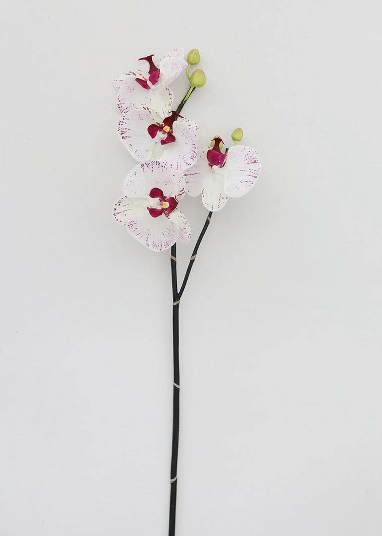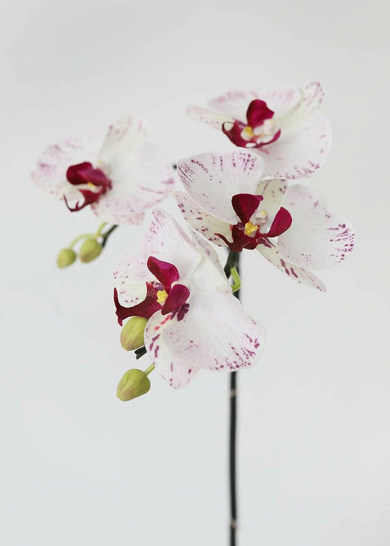 Elevate your silk flower arrangements with nature-inspired faux botanicals like this simply beautiful phalaenopsis orchid spray. Its artificial flowers are white with splashes of plum purple.